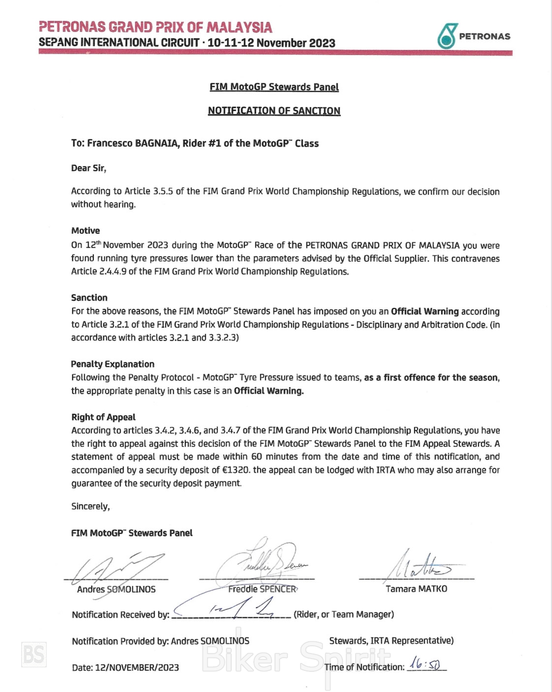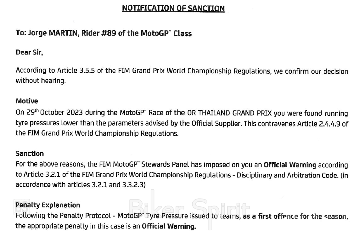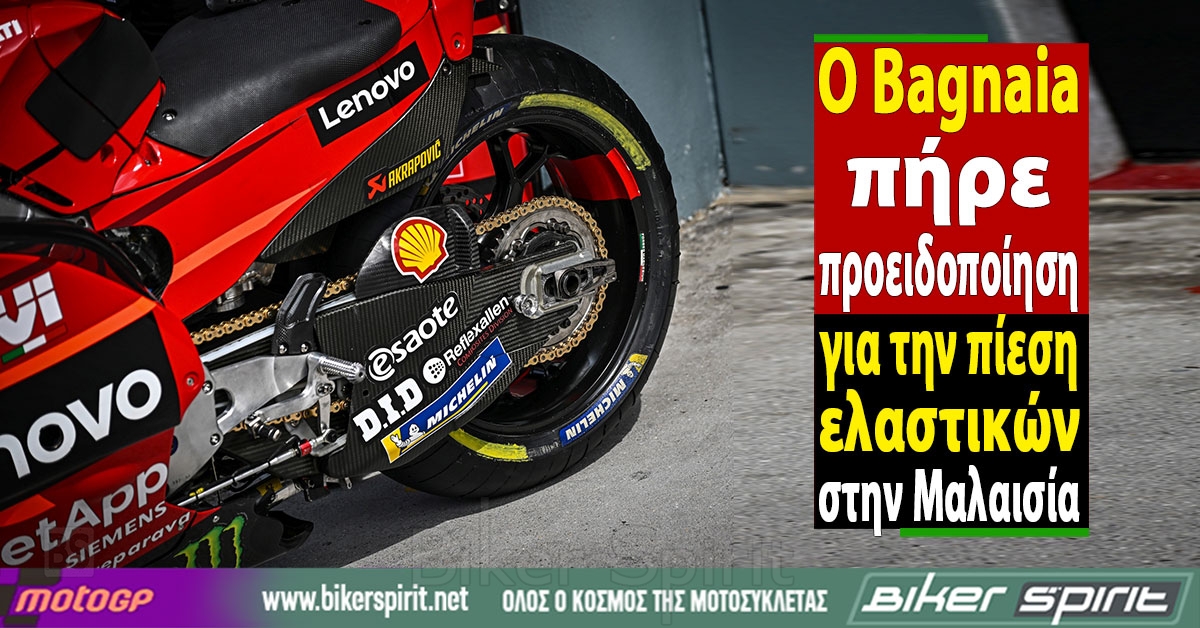 Μετα του τέσσερις αναβάτες Marco Bezzecchi, Aleix Espargaro , Raúl Fernández και Maverick Viñales που έλαβαν προειδοποίηση για μη τήρηση του κανόνα πίεσης των ελαστικών MotoGP, που ισχύει από τα μέσα της σεζόν, και την προειδοποίηση στον Martin στην Ταϊλάνδη, τώρα ήρθε η σειρά του Pecco Bagnaia.