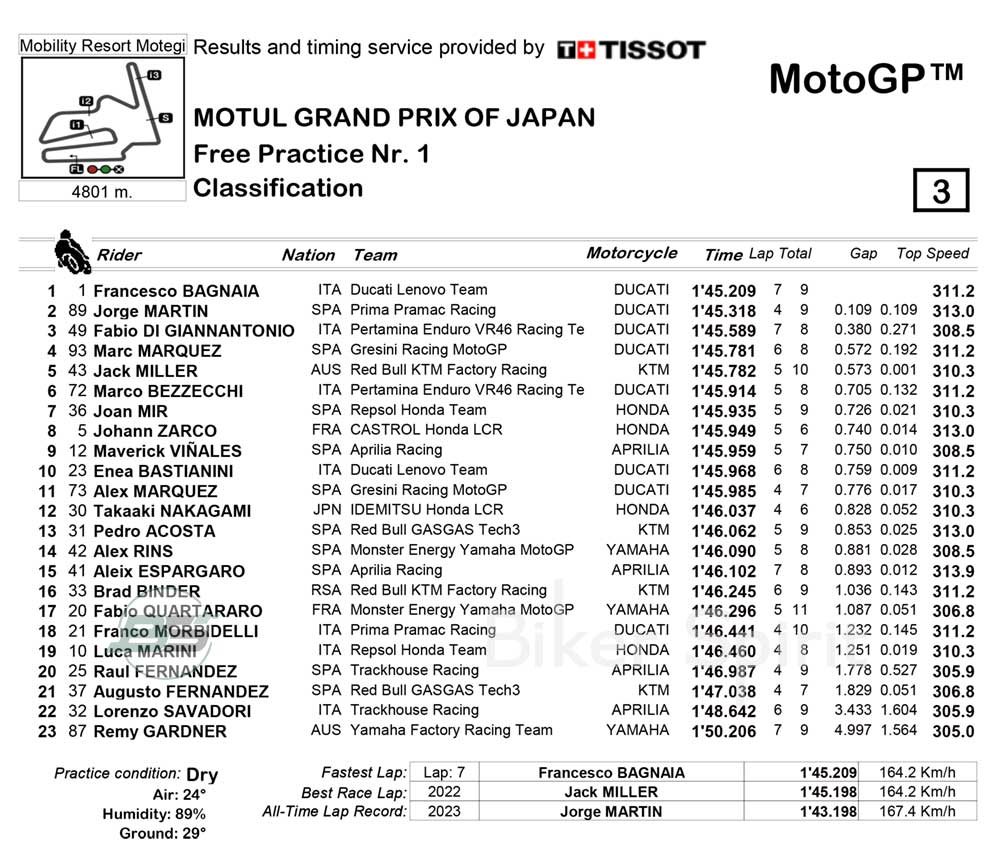Στην 4η θέση τέλειωσε το FP1 ο Marc Marquez στο Ducati GP 23 της Gresini Racing, μπροστά από τον Jack Miller με την KTM που σημείωσε τον πέμπτο ταχύτερο χρόνο μπροστά από τον Marco Bezzecchi (Ducati VR46 Racing Team) και τα Honda των Joan Mir (Team Repsol) και Johann Zarco (LCR). Τα δύο RC213V χωρίζονται από την κορυφή κατά 0,726s και 0,740s αντίστοιχα!