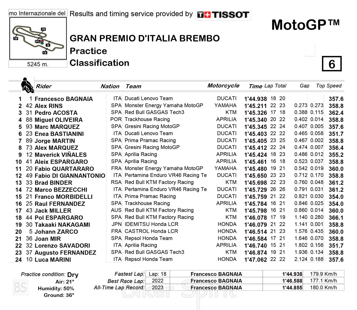 Την πρώτη εξάδα συμπλήρωσε ο Enea Bastianini, με το δεύτερο εργοστασιακό Ducati Desmosedici GP 24, μπροστά από τον επικεφαλής της βαθμολογίας Jorge Martin (Pramac Racing), με το Desmosedici GP 24.