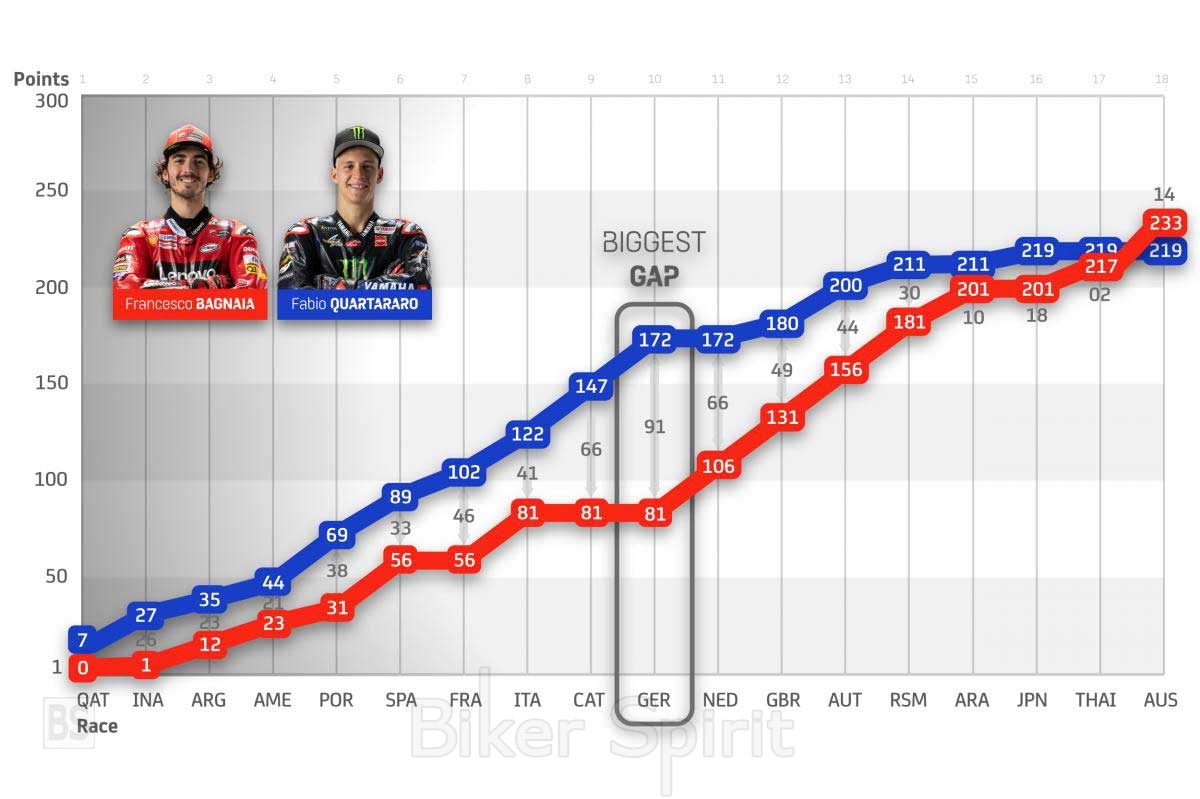 Εάν καταφέρει και κερδίσει τον τίτλο του 2022, ο “Pecco” όχι μόνο θα ήταν ο πρώτος στην ιστορία που θα το έκανε ανακτώντας τόσους πολλούς βαθμούς, αφού σε συνδυασμό με την κακή απόδοση μετα το καλοκαίρι του Quartararo κατάφερε να προηγείται, αλλά θα είναι ο δεύτερος που θα έπαιρνε τον τίτλο με τη Ducati μετά τον Casey Stoner το 2007.