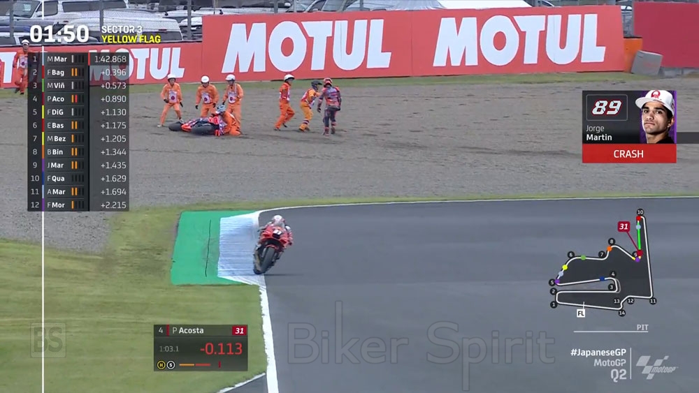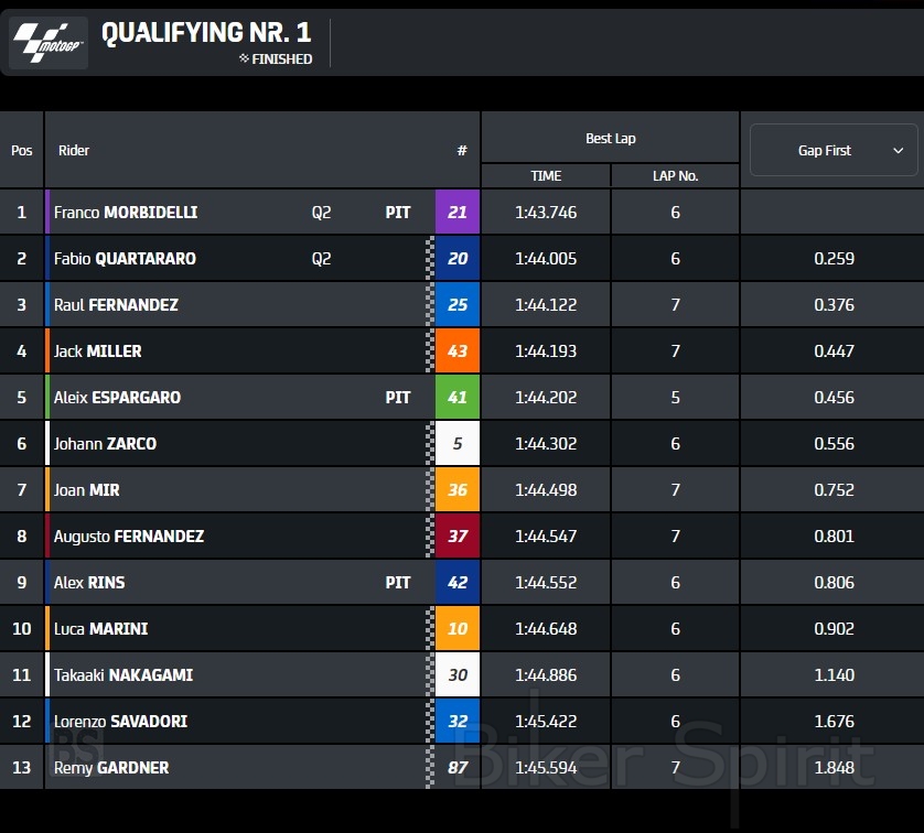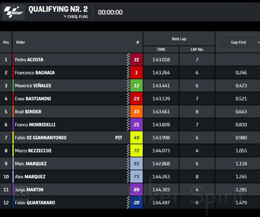 O Pedro Acosta κέρδισε την Pole position παρόλο που έκανε τον δεύτερο ταχύτερο γύρο, με 1:43.018, αφού οι αγωνοδίκες «είδαν» παραβίαση ορίων πίστας του Marquez Που συνέτριψε το ρεκόρ πίστας με 1:42.868, ενώ τον Acosta “δεν τον είδαν” όταν πέρασε απο τον Martin που είχε πέσει και παρόλα αυτά δεν ακυρώθηκε ο χρόνος του! – Οι κανόνες είναι κανόνες (αλα καρτ)