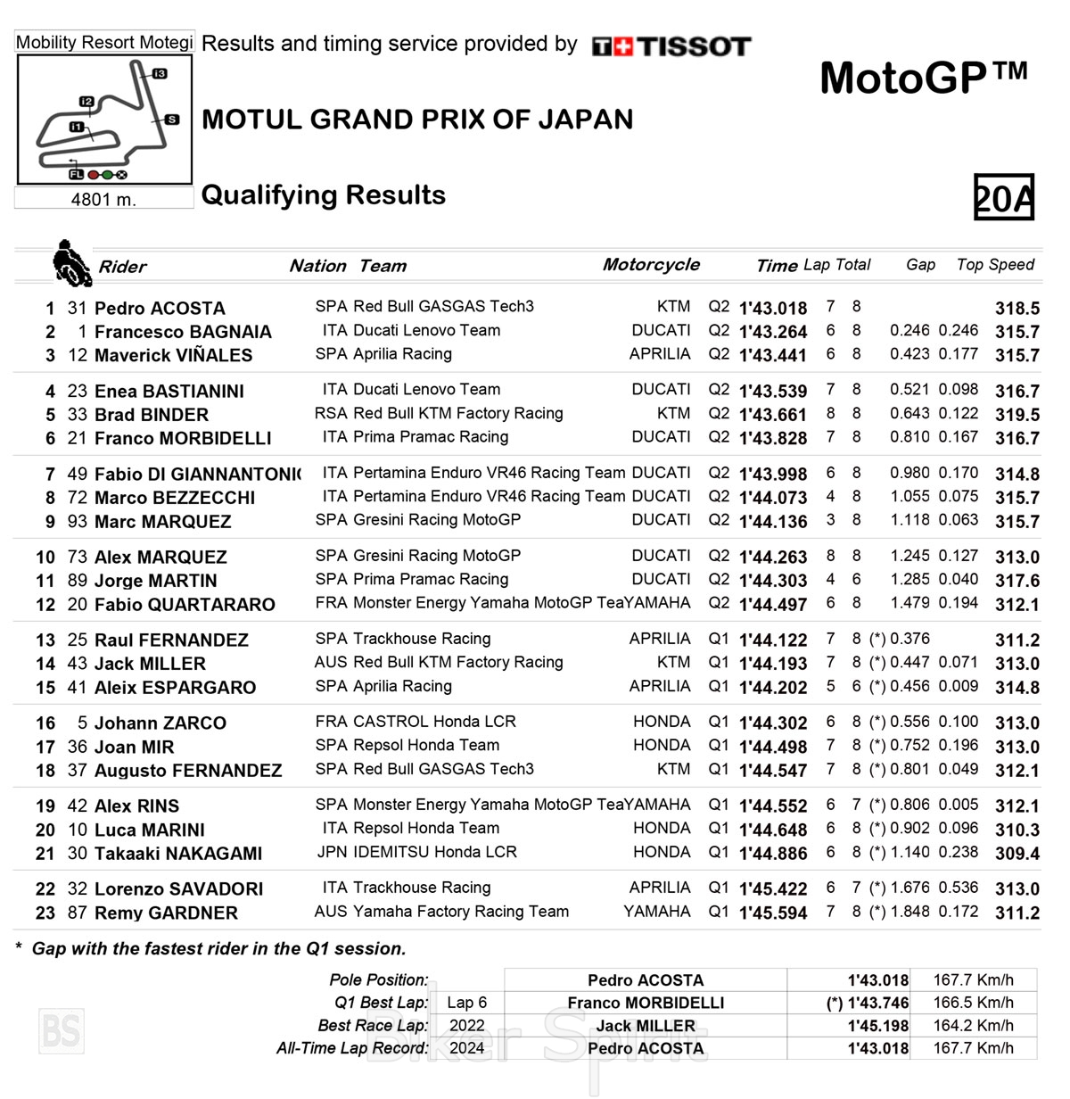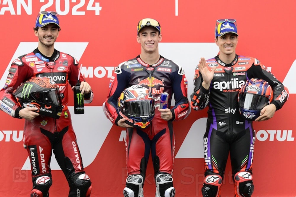 Στην 2η θέση θα εκκινήσει ο Pecco Bagnaia, που έγραψε χρόνο 1:43.264 με την πρώτη Ducati GP24 που είναι και η μοναδική στην πρώτη σειρά, ενώ στην 3η θέση θα βρεθεί ο Maverick Viñales που έκανε χρόνο 1:43.441, φέρνοντας το πρώτο εργοστασιακό Aprilia στην πρώτη σειρά!