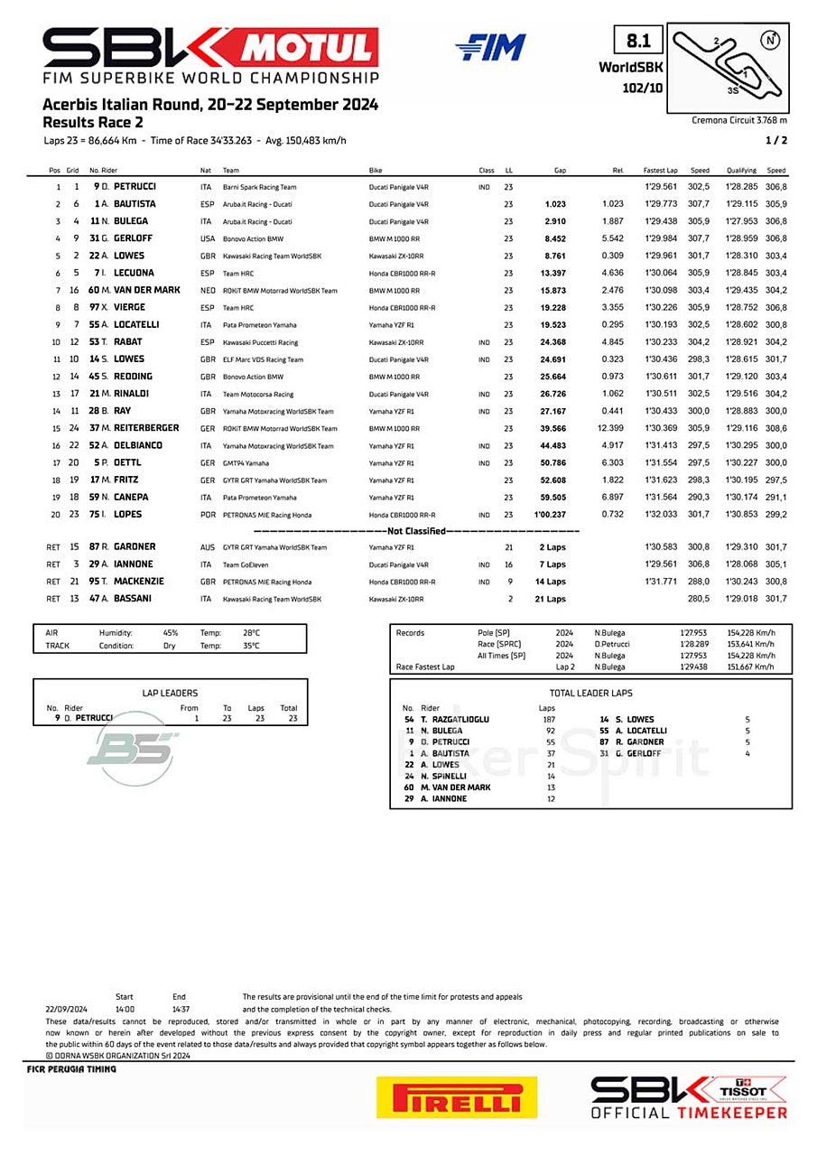 Ο Petrucci, αφού κέρδισε τον 1o αγώνα, αλλα και τον αγώνα Superpole, κυριάρχησε κερδίζοντας και τον 2ο αγώνα κάνοντας το 3 στα 3. Ανάμεσα στα πολλά ρεκόρ του Petrucci, πρέπει επίσης να προστεθεί ότι είναι ο πρώτος οδηγός ανεξάρτητης ομάδας που κέρδισε 3 αγώνες το ίδιο Σαββατοκύριακο.