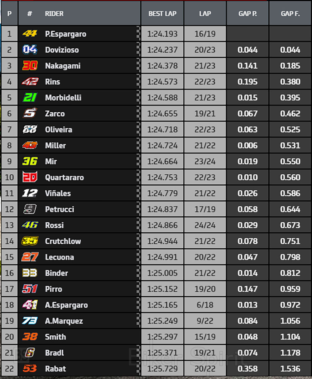 Ο νικητής του Μπρνο Brand Binder ήταν δέκατος έκτος, ενώ ο Pirro που αντικαθιστά τον τραυματισμένο Pecco Bagnaia ήταν ο δέκατος έβδομος.