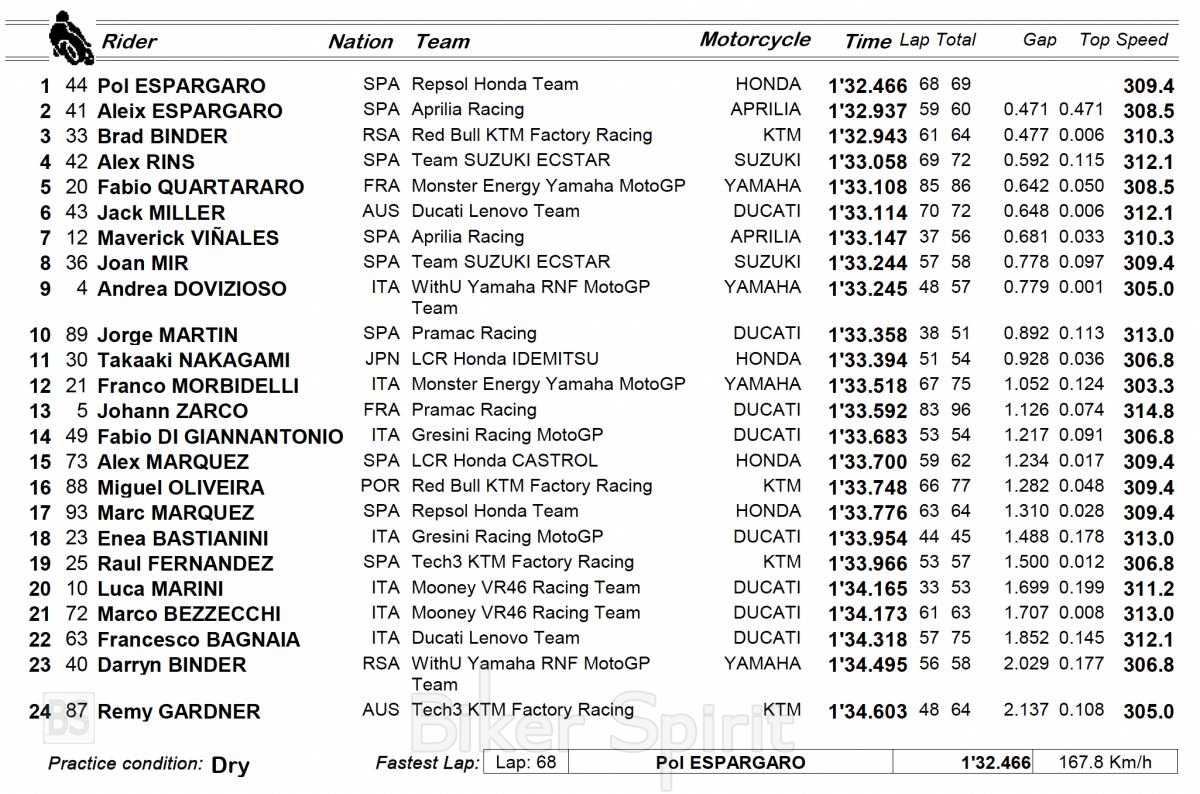 Στην 4η θέση το πρώτο Suzuki με τον Alex Rins, μπροστά από το πρώτο Yamaha με τον Fabio Quartararo και το πρώτο Ducati με τον Jack Miller.