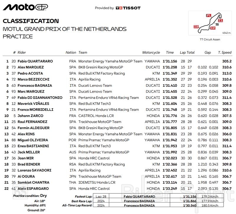 Ο Francesco Bagnaia, που έχει κερδίσει τα τρία τελευταία GP στο Assen, φάνηκε να δυσκολεύεται. Ξόδεψε ένα μαλακό ελαστικό χωρίς αποτέλεσμα πριν τη διακοπή με κόκκινη σημαία, αλλά βελτιώθηκε σημαντικά στον δεύτερο του χρόνο, φτάνοντας στην κορυφή με 1:31.410 προτού τον περάσουν οι Bezzecchi, Alex Marquez και ο Quartararo.