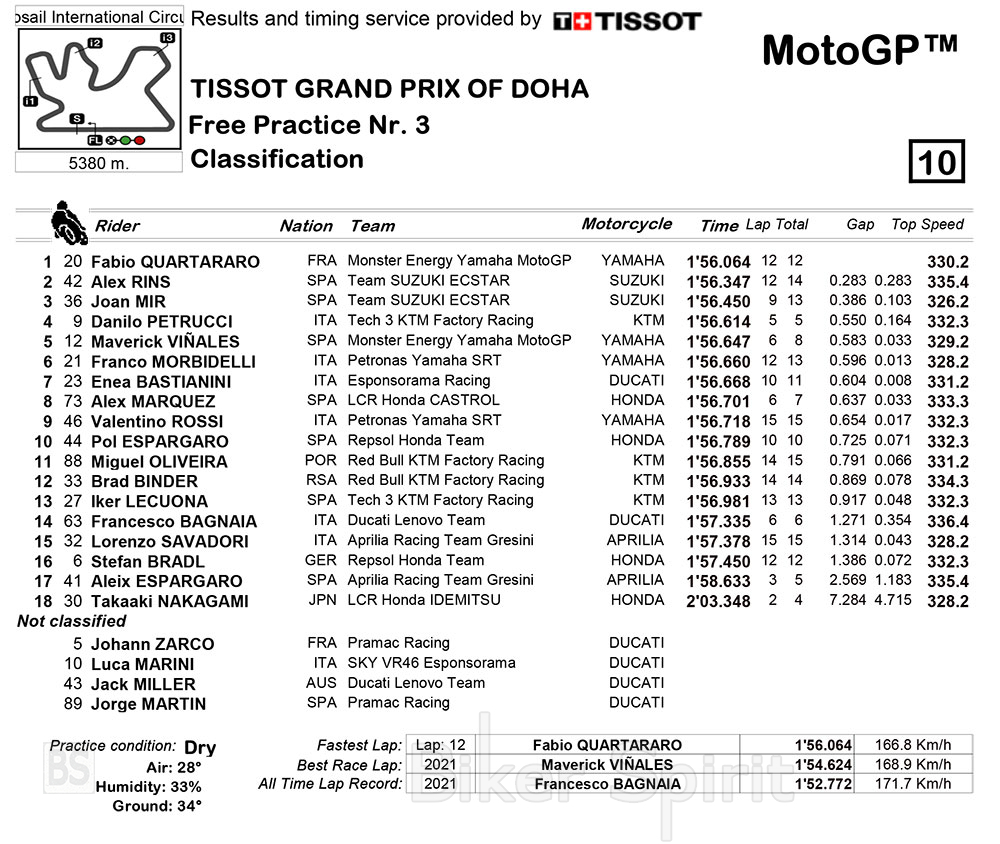 Αργοί χρόνοι για όλους όσους δοκίμασαν στο FP3 χωρίς καμία βελτίωση (όπως αναμενόταν λαμβάνοντας υπόψη τις καθημερινές συνθήκες σε σύγκριση με τις νυχτερινές), με τον καλύτερο γύρο του F3 να τον κάνει ο Fabio Quartararo.