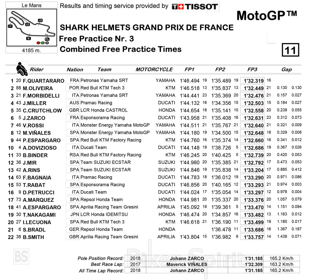 Τον 5ο καλύτερο χρόνο του FP3, έκανε το πρώτο Honda, αυτό του Cal Crutchlow, που έγραψε 1.32.558, ενώ την κορυφαία εξάδα έκλεισε ο Johan Zarco.