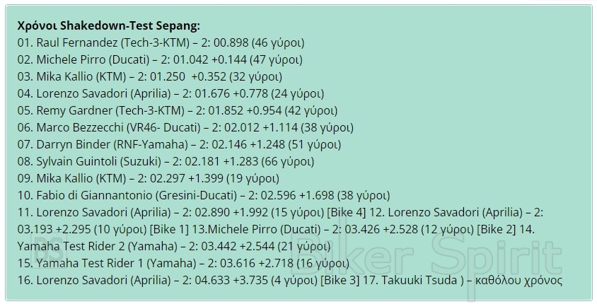 Η ημέρα 1 του Sepang Shakedown Test ολοκληρώθηκε καθώς οι πρωτάρηδες (Rookies) και οι αναβάτες δοκιμών επέστρεψαν στη Μαλαισία, με τον Raul Fernandez (Tech3 KTM Factory Racing) να γράφει τον ταχύτερο γύρο με χρόνο 2:00.898. Να θυμίσουμε ότι το ρεκόρ πίστας είναι 1’58.303, από το 2019 και το έχει σημειώσει ο Fabio Quartararo.