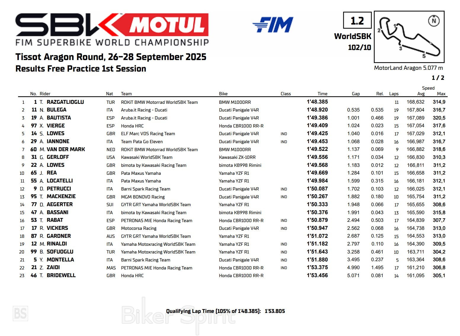 Ο Τούρκος αστέρας σταμάτησε το χρονόμετρο στο 1’48.385, επίδοση που τον έφερε μισό δευτερόλεπτο μπροστά από τον Ιταλό, όντας ο πρώτος που κατέβηκε στο 1’48s. Παρά το γεγονός ότι δεν βγήκε άμεσα στην πίστα με το πράσινο φως, ο Razgatlioglu έδειξε από την αρχή πως έχει έρθει στην Aragon με στόχο την πρώτη του νίκη στην ισπανική πίστα, αλλά και το 13ο συνεχόμενο θρίαμβο στη σεζόν.