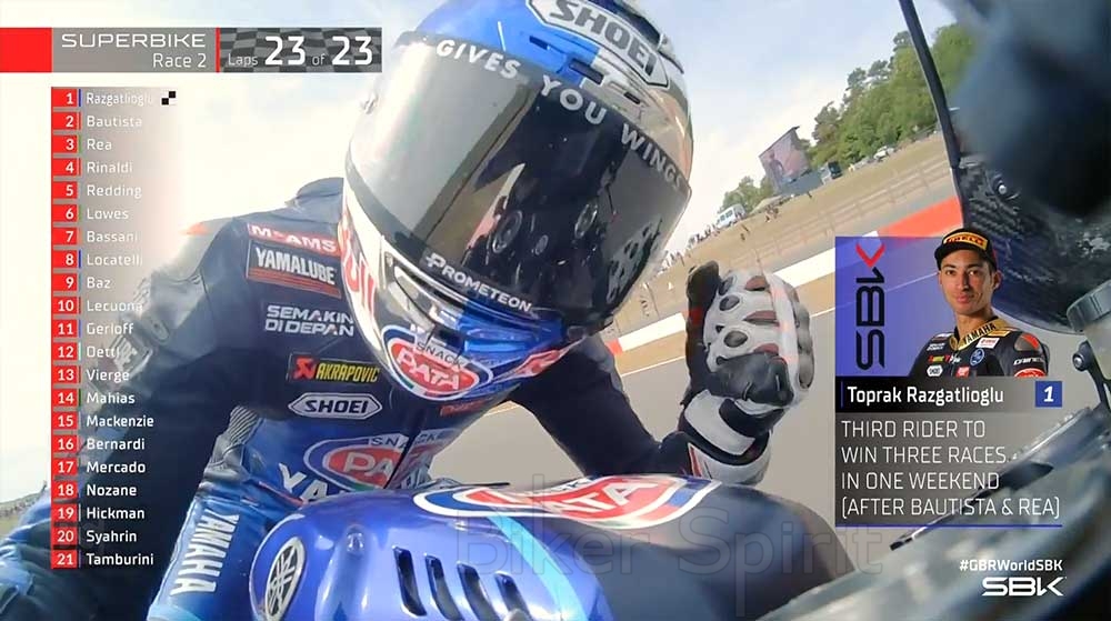 Ο Razgatlioglu από την μέση του αγώνα και μετά αφού άντεξε τις συνεχείς επιθέσεις του Rea άρχισε να ανοίγει την διαφορά του και να καταφέρνει να φτάσει στην 3η συνεχόμενη νίκη του στην Βρετανική πίστα του Donington, κυριαρχώντας όλο το Σαββατοκύριακο κάνοντας ένα φοβερό Χατ τρικ μετα από 4 γύρους χωρίς νίκη!
