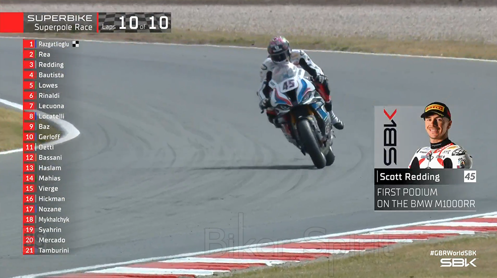 O Toprak Razgatlioglu (Pata Yamaha με Brixx WorldSBK), κάνοντας για άλλη μια φορά μια εκπληκτική εκκίνηση, μπήκε μπροστά και έμεινε εκεί μέχρι την καρό σημαία, του αγώνα Superpole των 10 γύρων, κάνοντας και νέο ρεκόρ γύρου αγώνα με το νέο ελαστικό SCQ της Pirelli σε πλήρη απόδοση.