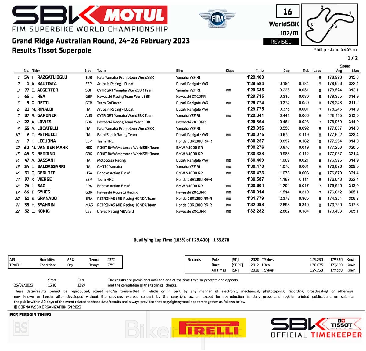 Από την δεύτερη θέση θα ξεκινήσει την υπεράσπιση του τίτλου του το 2023 ο Alvaro Bautista (Aruba.it Racing – Ducati) με διαφορά μολις+0,184s, ενώ την πρώτη σειρά κλείνει ο rookie Dominique Aegerter (GYTR GRT Yamaha WorldSBK Team) με διαφορά μόλις +0,235s στο ντεμπούτο του στην μεγάλη κατηγορία!
