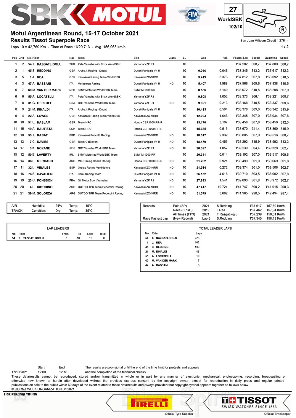 Ο πλησιέστερος τερματισμός της Αργεντινής ήταν αυτός του σημερινού αγώνα Superpole καθώς ο Razgatlioglu κέρδισε τον Redding με διαφορά μόλις 0.046s.