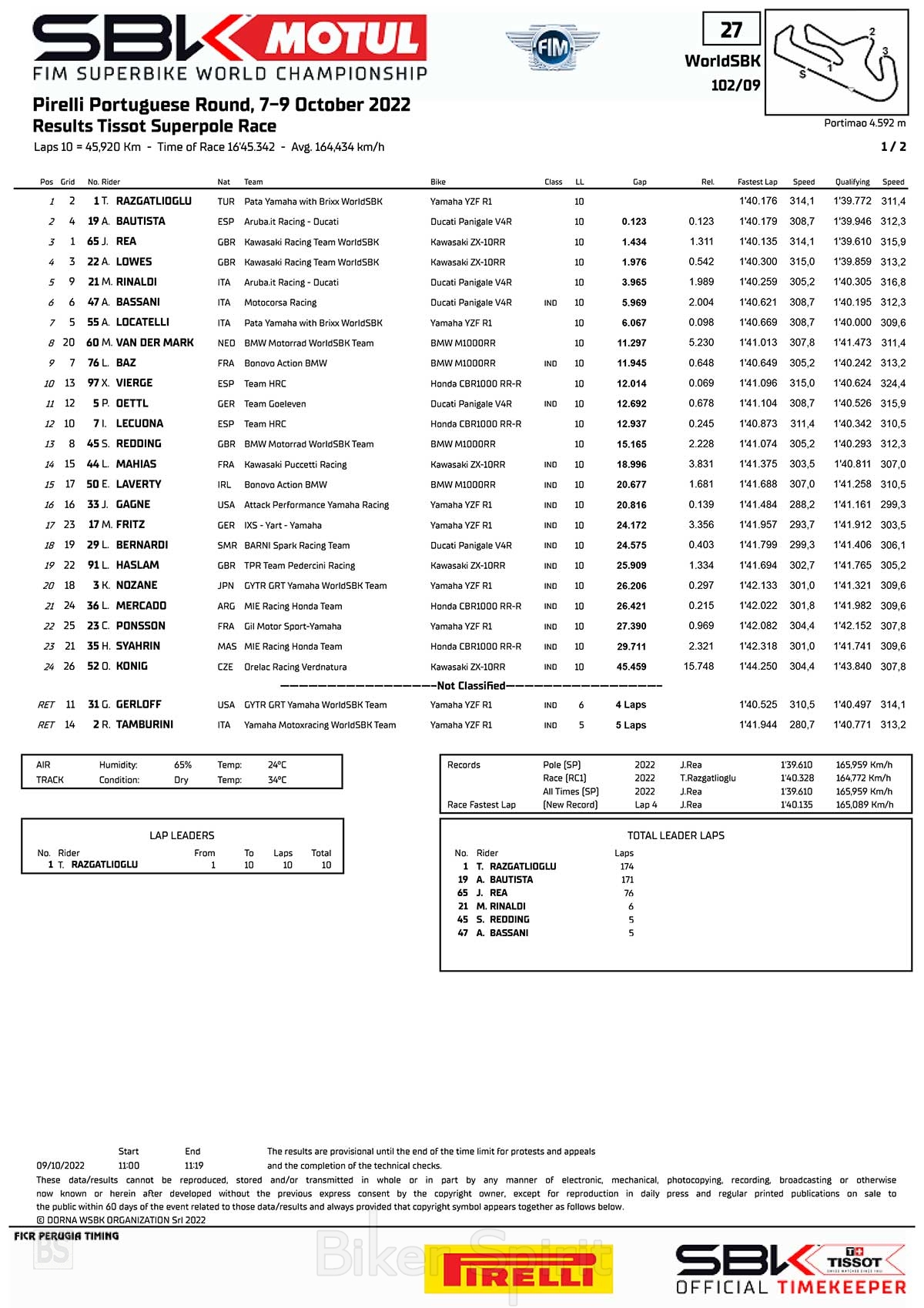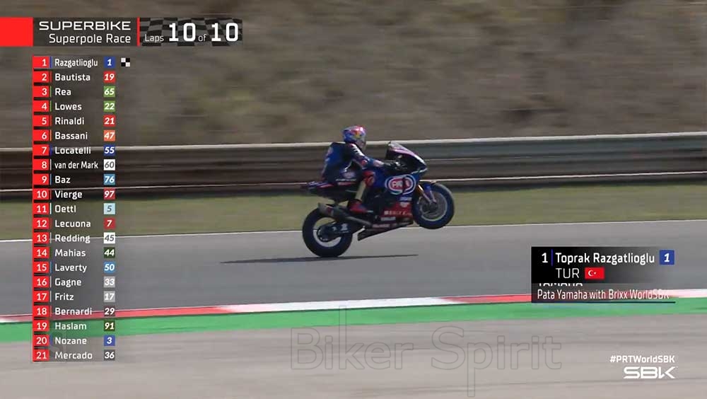 Ο Toprak Razgatlioglu μπήκε επικεφαλής από τον πρώτο γύρο και υπερασπίστηκε την θέση του από τον Alvaro Bautista (Aruba.it Racing – Ducati) που του επιτέθηκε σε κάθε γύρο, προσπερνώντας τον σχεδόν σε όλους τους γύρους στην ευθεία εκκίνησης τερματισμού με την πανίσχυρη Ducati Panigale V4R, αλλα ο Razgatlioglu με τον καταπληκτικό του τρόπο να φρενάρει δεν του άφησε περιθώριο να περάσει!