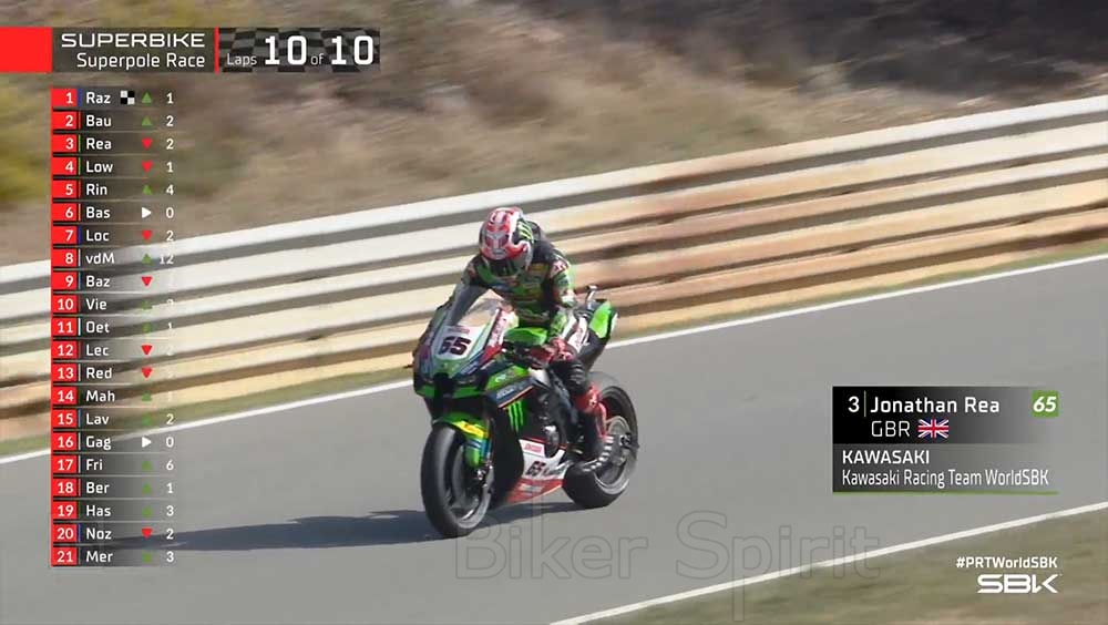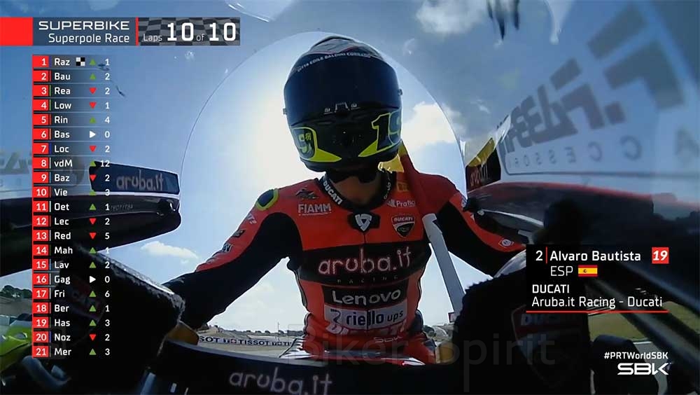 Έτσι ο Alvaro Bautista αρκέστηκε στην 2η θέση , κερδίζοντας το 50ο του βάθρο στο WSBK, και που τον κρατά επικεφαλής στην βαθμολογία με 51 βαθμούς διαφορά από τον Razgatlioglu και 73 από τον Rea.