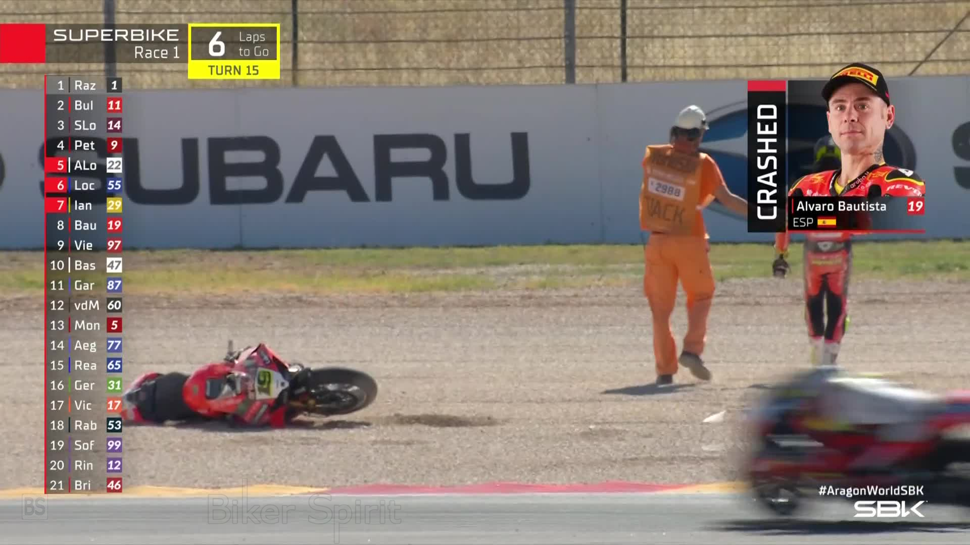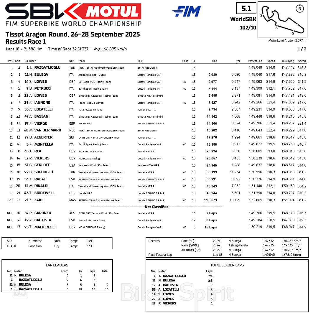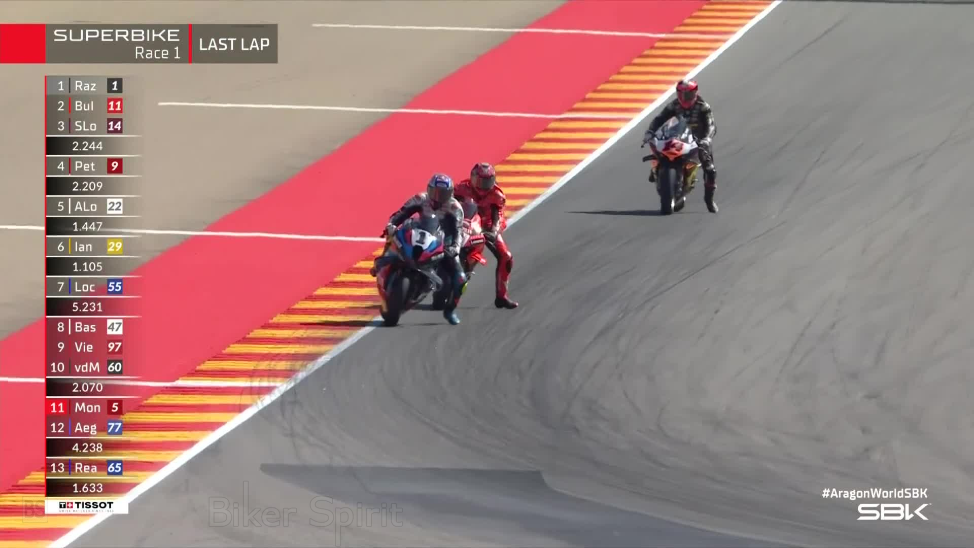 Στην τελική φάση του αγώνα, ο Razgatlioglu έδειξε για ακόμα μία φορά τον απίστευτο χαρακτήρα του. Με προσωπικούς ταχύτερους γύρους, κράτησε πίσω του τον Bulega, ο οποίος με τη σειρά του σημείωσε την ταχύτερη επίδοση αγώνα στον τελευταίο γύρο (1’49.040), χωρίς όμως να καταφέρει να περάσει ξανά τον Παγκόσμιο Πρωταθλητή. Ο Τούρκος πανηγύρισε έτσι την 13η συνεχόμενη νίκη του, δείχνοντας πως η φόρμα του παραμένει ασταμάτητη.