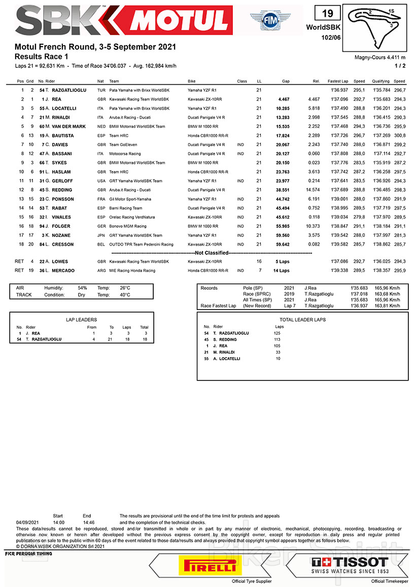 Μπαίνοντας στον τελευταίο γύρο, ο Razgatlioglu πήρε τη νίκη κερδίζοντας τον Rea, ο οποίος διέσχισε τη γραμμή του τερματισμού στη δεύτερη θέση, μπροστά από τον Locatelli. Με αυτό το αποτέλεσμα, τωρα ο Razgatlioglu πέρασε 5 βαθμούς μπροστά από Rea στη γενική κατάταξη, οπότε ο ενθουσιασμός για την ανάδειξη του τίτλου για το τέλος της σεζόν αυξήθηκε.