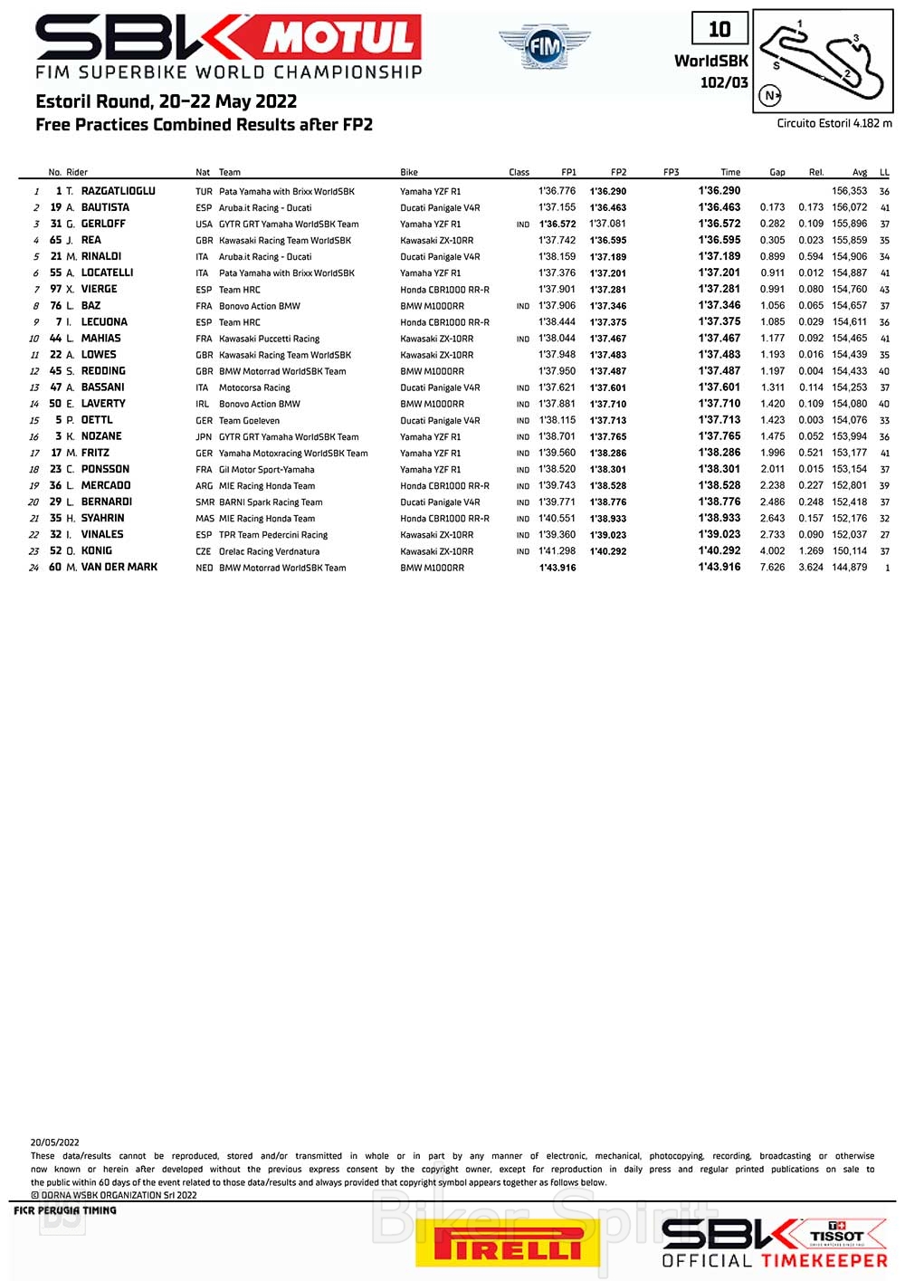 Στην δεύτερη θέση ο ηγέτης του Πρωταθλήματος Alvaro Bautista (Aruba.it Racing – Ducati), μπροστά από τον Garrett Gerloff (GYTR GRT Yamaha WorldSBK Team) που ήταν στην κορυφή του FP1 και τρίτος στο FP2. Ο Αμερικανός αναβάτης πήρε δύο βάθρα στο Estoril το 2020 και ήταν στον αγώνα για το βάθρο και πέρυσι,
