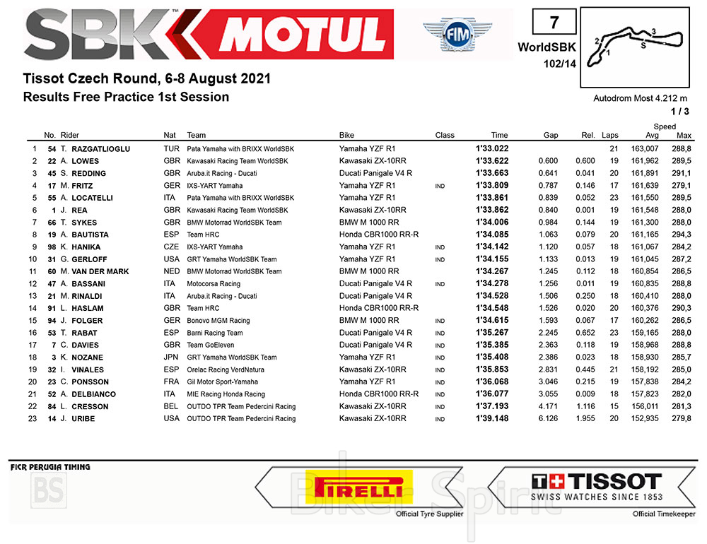 Ολοκληρώνοντας τη συνεδρία ήταν ο Toprak Razgatlioglu (Pata Yamaha με το BRIXX WorldSBK), που έκανε τον ταχύτερο γύρο στο τελευταίο δεκάλεπτο, που καταγράφεται για πρώτη φορά στην πίστα του Autodrom Most.