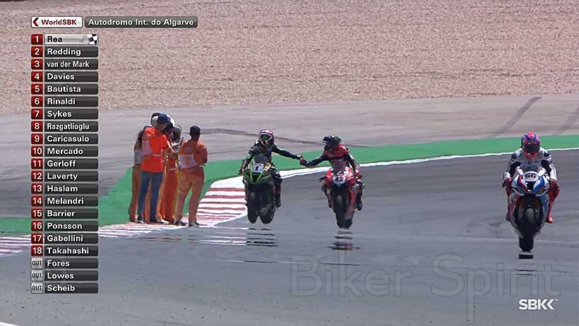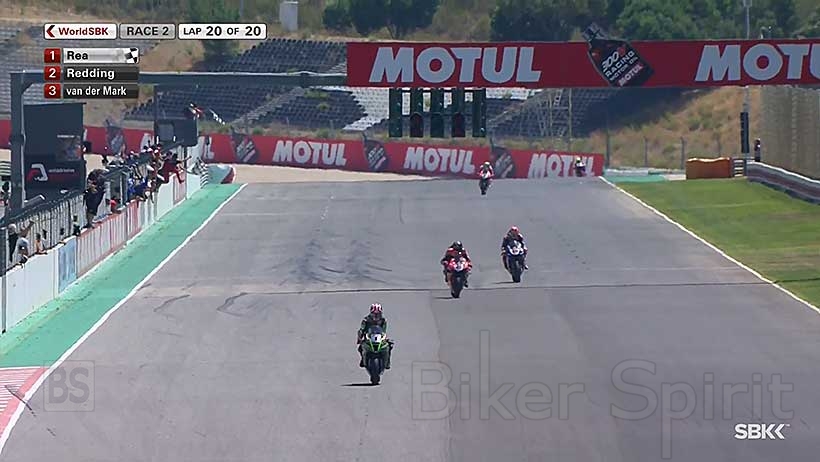 Ο Scott Redding (ARUBA.IT Racing – Ducati) κέρδισε μια εκπληκτική δεύτερη θέση, διασφαλίζοντας ότι ο Rea δεν θα του φύγει πολύ στην κατάταξη του Πρωταθλήματος, έχοντας μια θεαματική μάχη με τον Michael van der Mark (PATA YAMAHA WorldSBK Επίσημη Team) ?