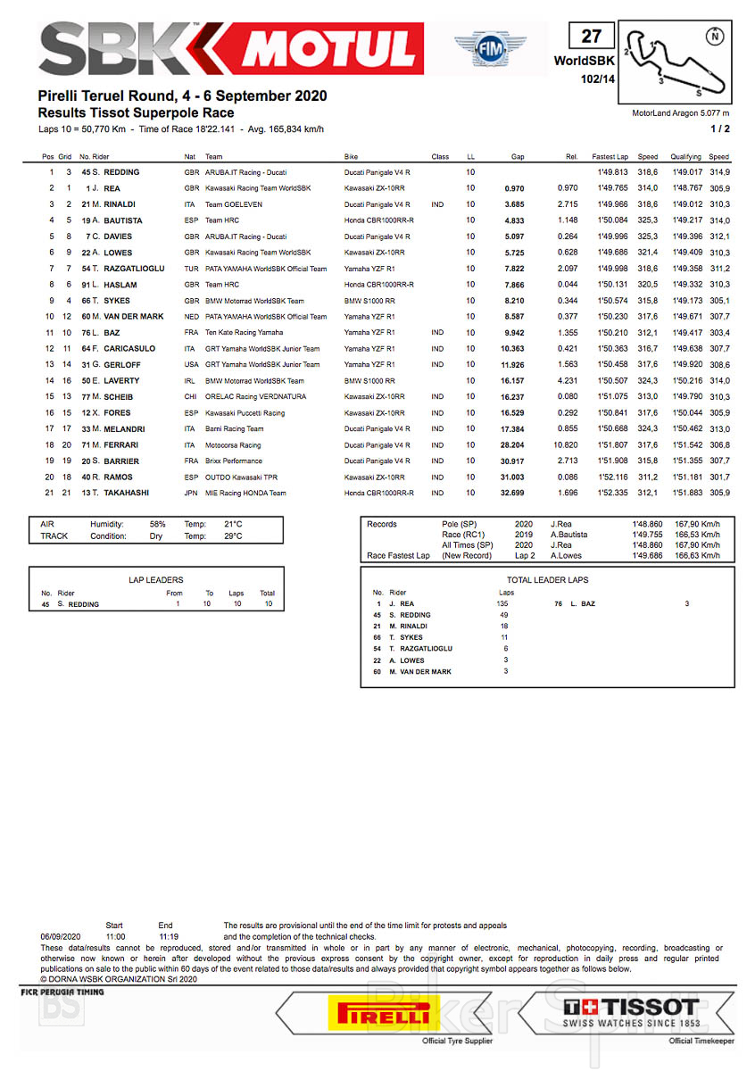 Οι δύο πρώτοι της γενικής κατάταξη του Παγκόσμιου Πρωταθλήματος συμμετείχαν σε μια τιτανική μάχη στον Superpole Race με τον Scott Redding να διεκδικεί μια εκπληκτική νίκη καθώς ήταν το τέλειος τρόπος να επανέλθει μετά την πτώση του στον Race 1, σπάζοντας το σερί του Jonathan Rea των έξι νικών στους Superpole Races.