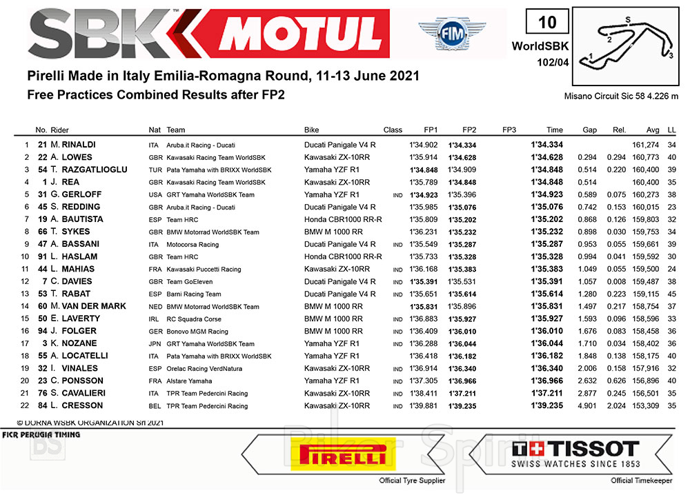 Στην 2η θέση τέλειωσε την ημέρα του ο Alex Lowes (Kawasaki Racing Team WorldSBK), ο οποίος έκανε τον ταχύτερο γυρο του στο τέλος του Free Practice 2.