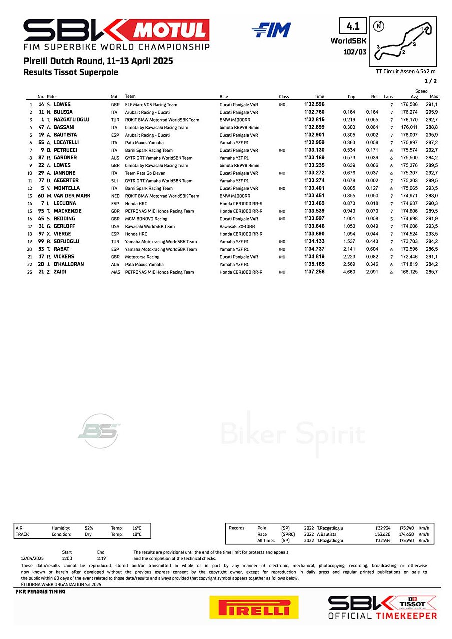 Ο Βρετανός αναβάτης, με χρόνο 1:32.596 και είχε διαφορά μεγαλύτερη από ένα δέκατο από τον πρωτοπόρο του πρωταθλήματος Nicolo Bulega (Aruba.it Racing – Ducati), με τον Toprak Razgatlioglu (ROKiT BMW Motorrad WorldSBK Team) να βρίσκεται στην τρίτη θέση για τον ολλανδικό γύρο του 2025.