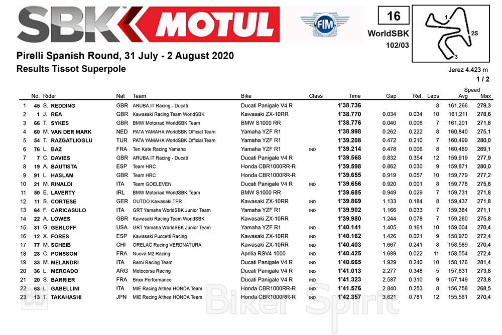 Την πρώτη σειρά κλείνει ο γνωστός κάτοχος του ρεκόρ των Superpole, Tome Sykes πάνω στο BMW S1000 RR, με χρόνο 1’38.776.