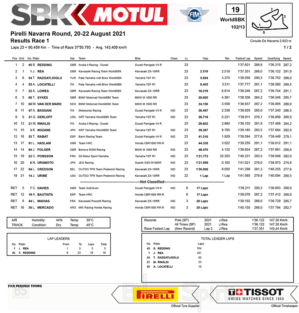 Νικητής του πρώτου αγώνα του 7ου γύρου της σεζόν Pirelli Navarra Round ήταν ο Scott Redding (Aruba.it Racing – Ducati), κερδίζοντας τη δεύτερη συνεχόμενη νίκη του φέτος!