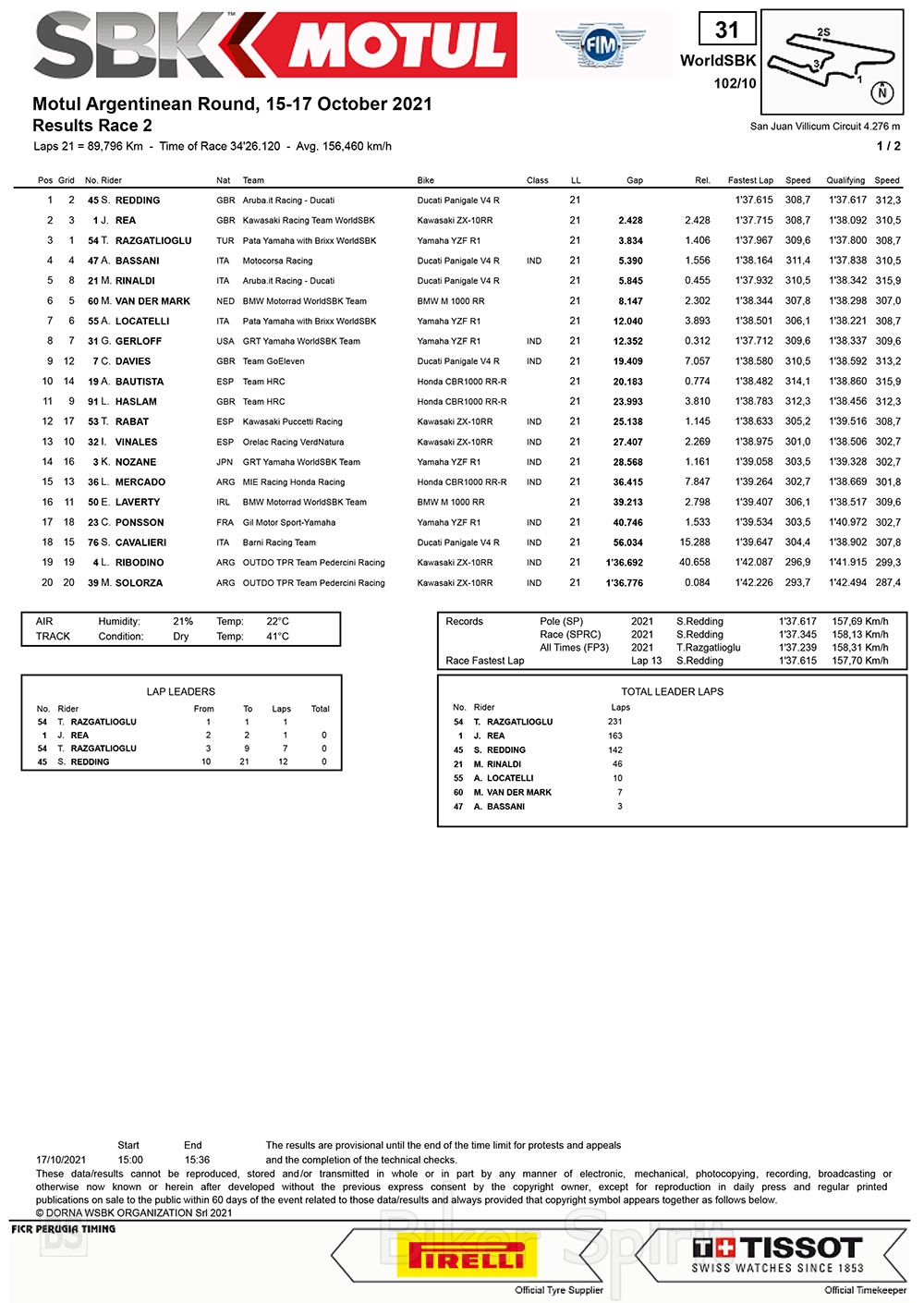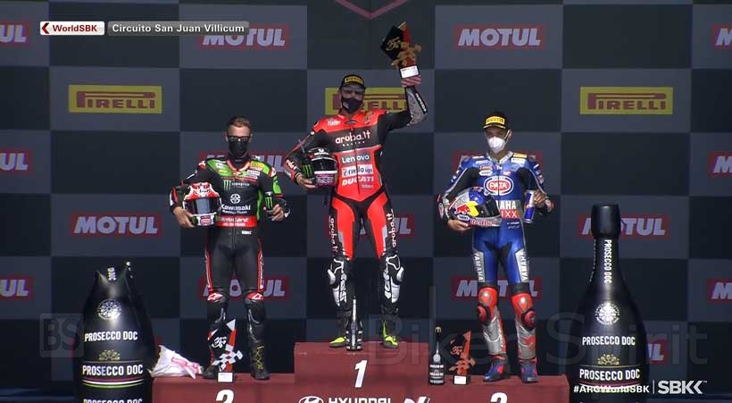 Οι μάχες ήταν θεματικές και κράτησαν την αγωνία ψιλά μέχρι την μέση του αγώνα με την πρώτη θέση να αλλάζει μεταξύ των Jonathan Rea, Toprak Razgatlioglu και Redding, με τον οδηγό της Ducati να επικρατεί τελικά και να ανεβαίνει στο ψηλότερο σκαλί του βάθρου!