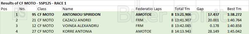 Ο νεαρός Έλληνας οδηγός, Σπύρος Αντωνίου ξεκίνησε από την pole position και κέρδισε τον αγώνα, μπροστά από τον Cazacu Andrei και Voinea Alexandru που έκλεισαν το βάθρο.