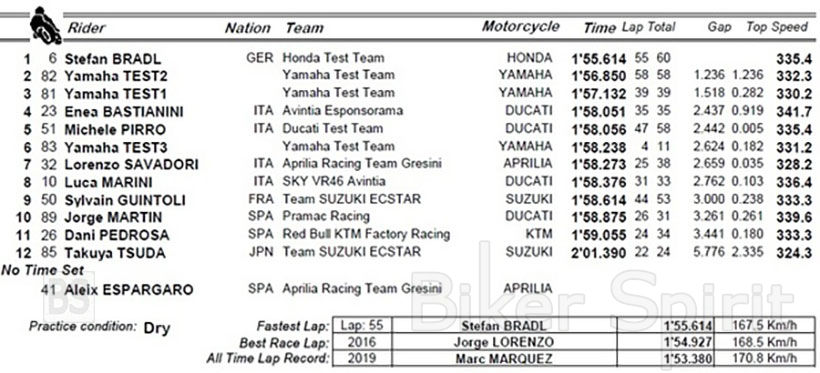 Όγδοος ήταν ο άλλος Ιταλός πρωτάρης, ο Luca o Luca Marini, μπροστά από τον οδηγό της Suzuki, Sylvain Guintoli. Ο rookie Jorge Martin, της Ducati Pramac, ήταν δέκατος λόγω μια πτώσης χωρίς συνέπειες την τελευταία ώρα των δοκιμών. Στην 11η θέση ήταν το KTM του Dani Pedrosa, ενώ ο άλλος αναβάτης δοκιμών της Suzuki , Takuya Tsuda έκλεισε την λίστα των οδηγών που πήραν μέρος στην πρώτη ημέρα δοκιμών shakedown.