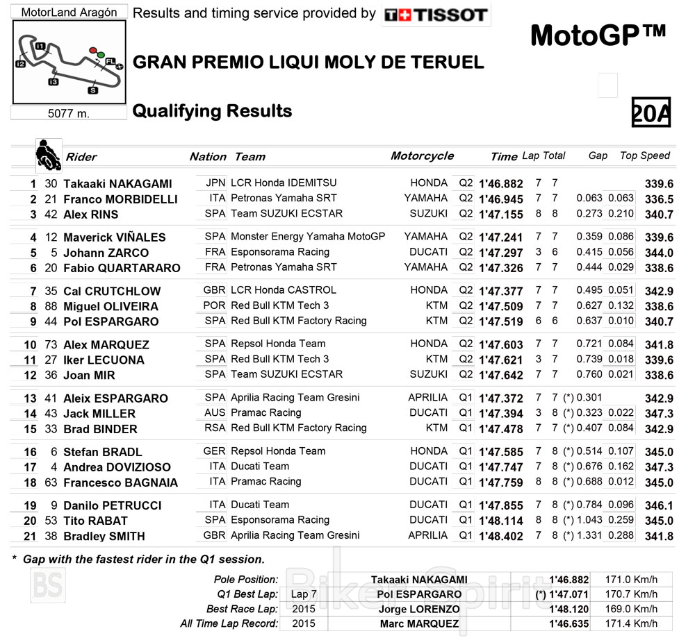 Από την δεύτερη θέση θα ξεκινήσει ένας ακόμα δορυφορικός οδηγός, ο Franco Morbidelli με Yamaha με χρόνο 1.46.945 κάνοντας δυο τους οδηγούς που κατέβηκαν στο 1.46s!