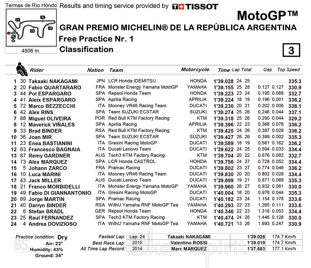 Ταχύτερος του FP1 ο Takaaki Nakagami όπου έφτασε στην κυριολεξία την τελευταία στιγμή αφού πριν από 24 ώρες βρισκόταν στη Βαρκελώνη “θρηνώντας” ένα θετικό τεστ για Covid και τώρα σημείωσε τον ταχύτερο χρόνο στην Αργεντινή.
