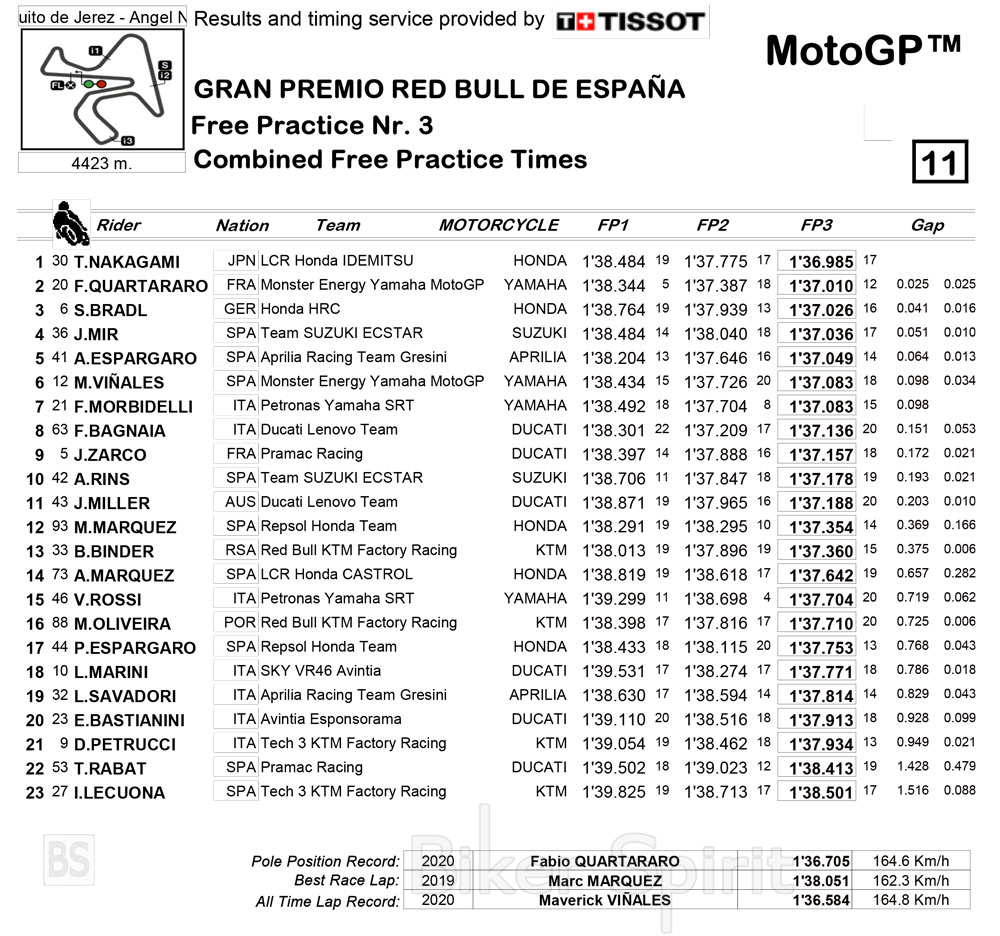 Στην δεύτερη θέση ήταν το Yamaha του Fabio Quartararo με μόλις 25 χιλιοστά διαφορά, ενώ στην τρίτη θέση είναι ένα ακόμα Honda αυτό του οδηγού δοκίμων Stefan Bradl, με διαφορά μόλις 15 χιλιοστά.