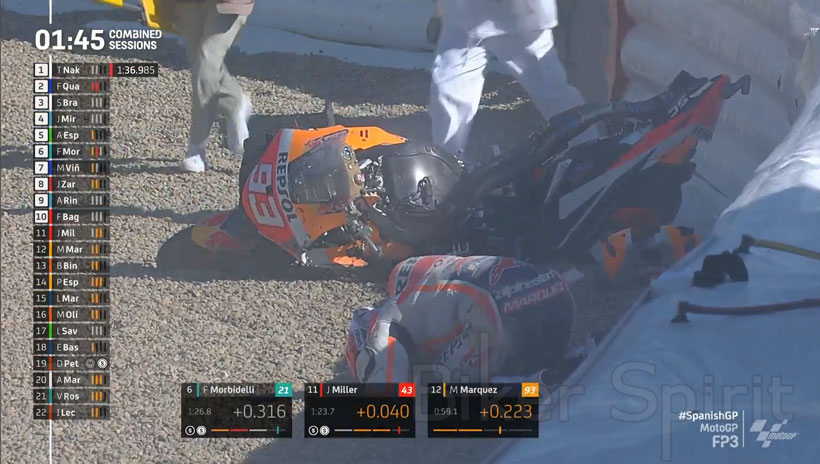 Μια τρομακτική πτώση στη στροφή 7 είχε ο είχε Marc Marquez, ο οποίος στη συνέχεια πήγε πίσω στο γκαράζ, χωρίς να πάει στο ιατρικό κέντρο. Ο οκτώ φορές παγκόσμιος πρωταθλητής είναι στην 12η θέση, αφού η πτωχή του ήταν πριν καταφέρει να κάνει τον τελευταίο γρήγορο γυρο του.
