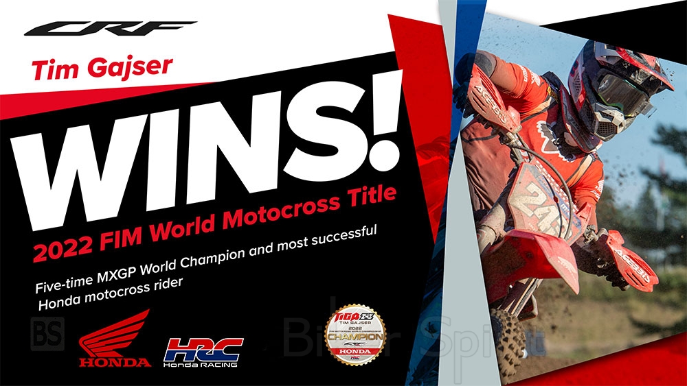 Tim Gajser 243 Τι μέρα κι αυτή! Σίγουρα δεν οδήγησα τόσο καλά όσο θα μπορούσα, αλλά πέτυχα τον στόχο μου και αυτό ήταν που είχα σκοπό να φέρω εις πέρας στην αρχή της ημέρας. Πέντε παγκόσμιοι τίτλοι, πραγματικά είναι απίστευτο. Δεν το έχω συνειδητοποιήσει ακόμα. Ένα μεγάλο ευχαριστώ σε όλη την HRC Team, τους ανθρώπους που βρίσκονται στους αγώνες και για όλη την υποστήριξη από την Ιαπωνία. Επίσης, θα ήθελα να ευχαριστήσω την κοπέλα μου και για όλη την υποστήριξη που λαμβάνω από τους θαυμαστές μου σε όλο τον κόσμο. Ήταν υπέροχο να βλέπω τόσους πολλούς να με επευφημούν στην πίστα, και σίγουρα το ευχαριστώ αυτό είναι λίγο. Είναι μια ιδιαίτερη στιγμή για μένα και είμαι πολύ χαρούμενος που πήρα τον πέμπτο μου τίτλο!