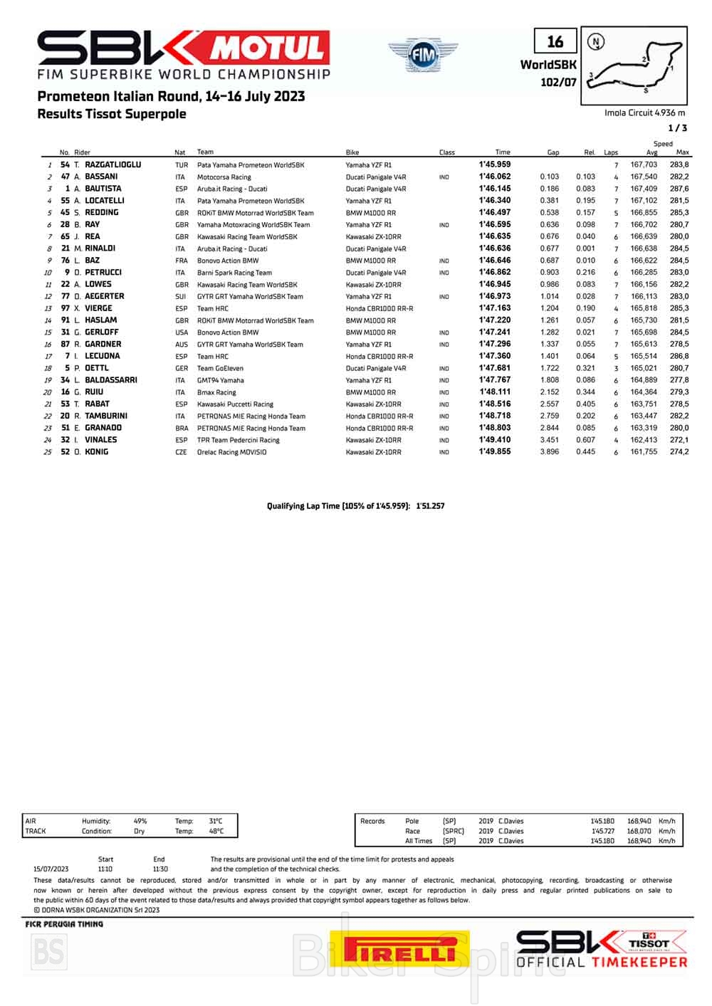 Ο Toprak Razgatlioglu κέρδισε την Pole position του αγώνα της Imola, για τον έβδομο γύρο του Παγκόσμιου Πρωταθλήματος Superbike 2023.