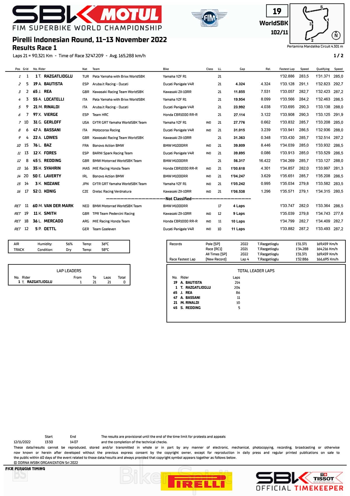 Ο πρωταθλητής 2021, Toprak Razgatlioglu ήταν άνετος νικητής του 1ου αγώνα στην Ινδονησία, κερδίζοντας τον 900ο αγώνα του WorldSBK αφού είχε κερδίσει παλιότερα και τον 800ο αγώνα του Πρωταθλήματος επίσης!