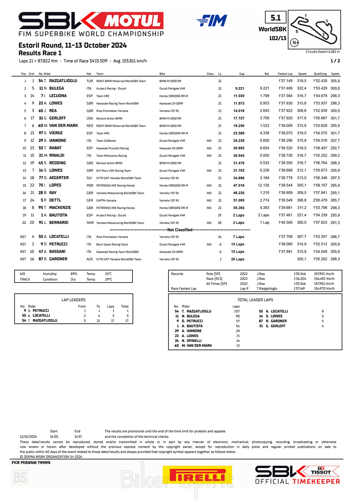 Μετά από έναν αρχικό δισταγμό, παρόλο που ξεκίνησε από την pole ο Razgatlioglu πέρασε στην κορυφη του αγώνα και κυριάρχησε μέχρι την καρό σημαία. Πίσω από τον #54, ανάμεσα σε διάφορες μάχες και ατυχήματα, ο Nicolò Bulega τερμάτισε δεύτερος μπροστά από τον Iker Lecuona, ο οποίος επανάφερε τη Honda στο βάθρο μετα από πάρα πολύ καιρό!