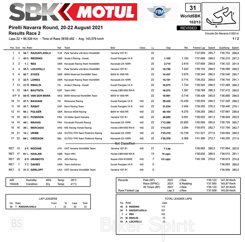Έτσι το βάθρο διαμορφώθηκε με τον Razgatlioglu στην πρώτη θέση , μπροστά από τον Redding και τον Rea στην τρίτη θέση. Έτσι ο Razgatlioglu έχει 17 βάθρα στην σεζόν του 2021, που ισοφαρίζει το ρεκόρ των βάθρων για έναν αναβάτη της Yamaha, με τον Ben Spies το 2009.