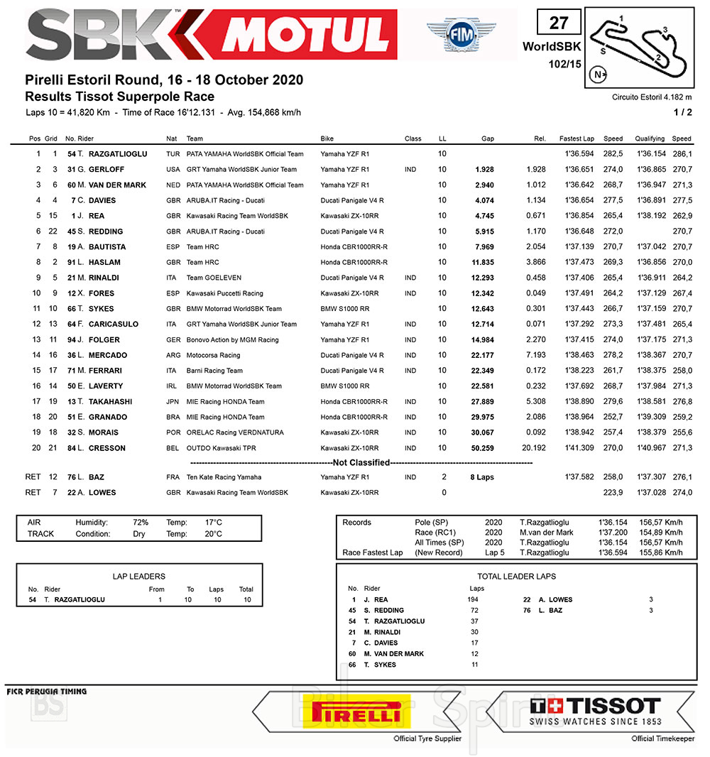 Ο αγώνας Superpole για τον Pirelli Estoril Round είχε νικητή τον Toprak Razgatlioglu (PATA YAMAHA WorldSBK Official Team) που ξεκίνησε από την pole, χωρίς να πιεστεί καθόλου από τους αντιπάλους του, όπως εχθές το πρώτο αγώνα.