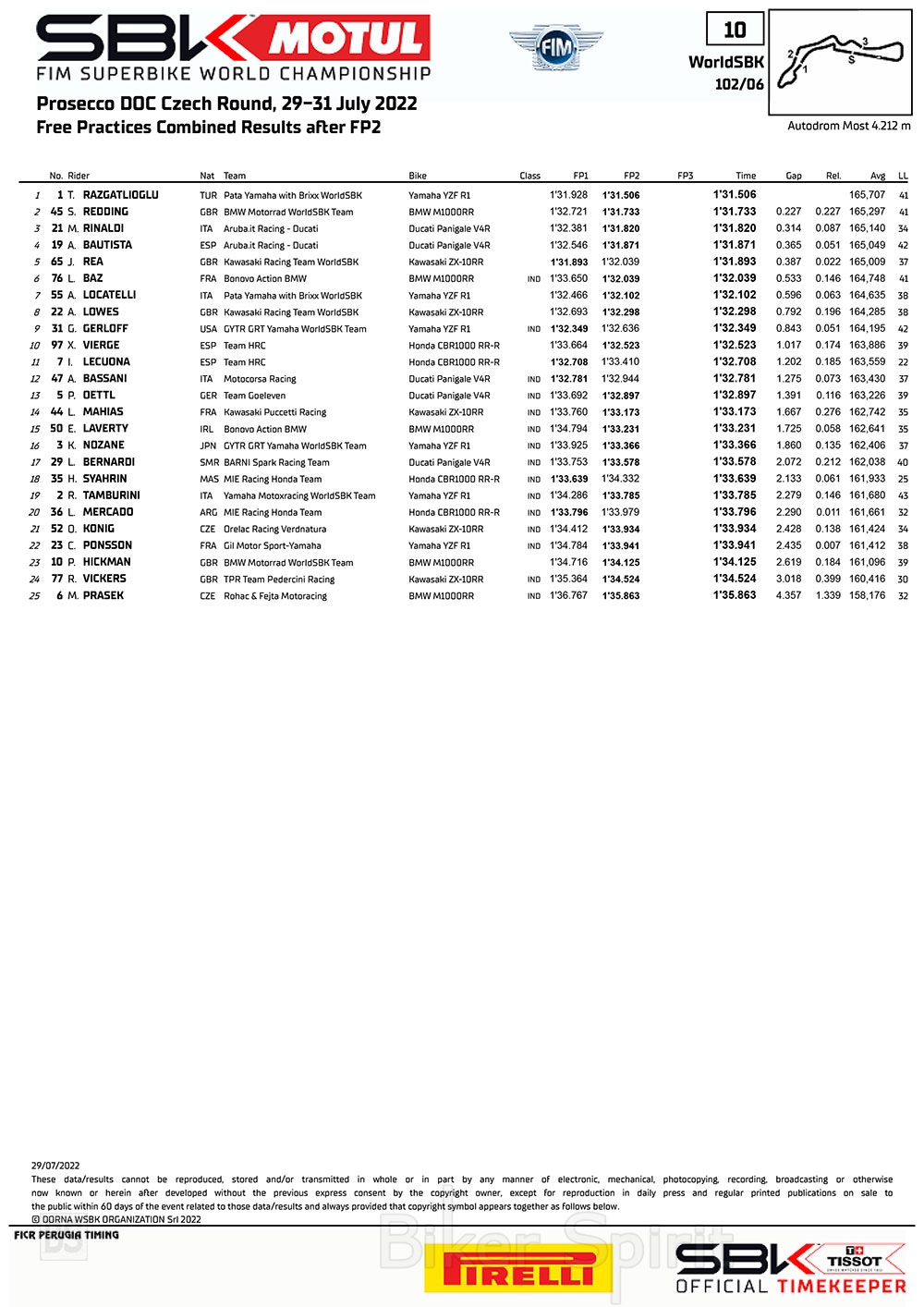 Με χρόνο 1’31.506 ο Toprak Razgatlioglu ανέβηκε στην κορυφη της πρώτης ημέρας, ενώ ο ομόστυαλός του Andrea Locatelli, τερμάτισε έβδομος στο FP2 και συνολικά.
