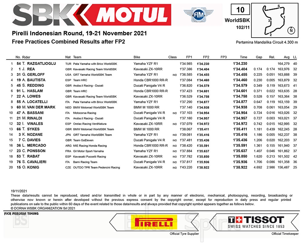Μετά την πρώτη μέρα στην ολοκαίνουργια πίστα, ήταν ο Toprak Razgatlioglu (Pata Yamaha με Brixx WorldSBK) που έκανε τον ταχύτερο γύρο στο FP1 όσο και στο FP2, γράφοντας το μεσημέρι χρόνο 1’34.230s.