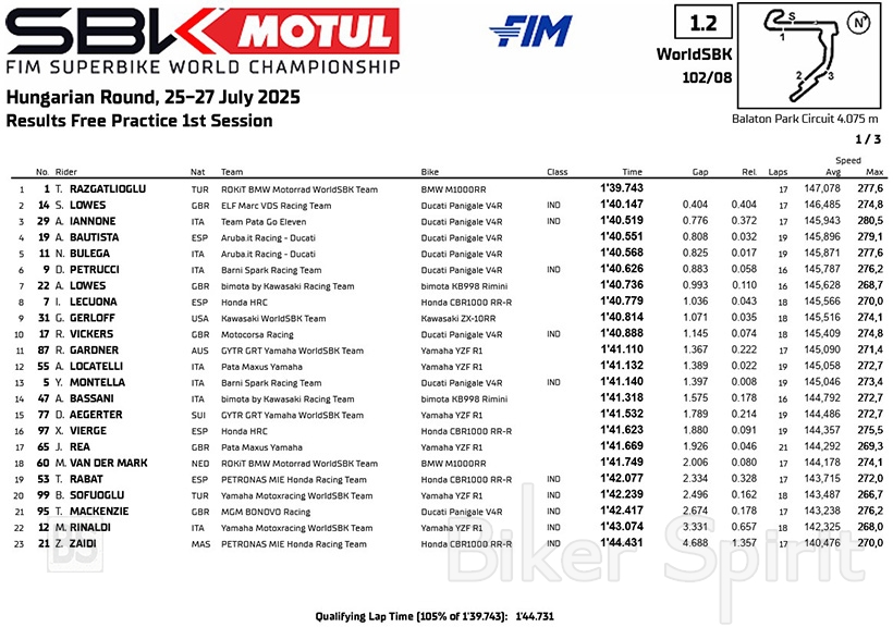 ο Toprak Razgatlioglu κυριάρχησε στην πρώτη ελεύθερη δοκιμή του WorldSBK στο Balaton Park, υπογράφοντας τον ταχύτερο χρόνο της ημέρας με 1:39.743 και ήταν ο μόνος αναβάτης κάτω από το 1:40.