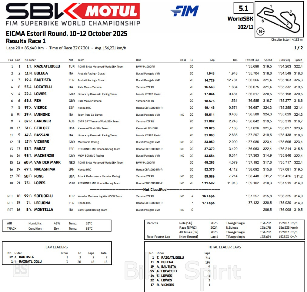 Σε τρεις γύρους ακόμη, ο Razgatlioglu έκανε αυτό που ξέρει καλύτερα: επιβλήθηκε στα φρένα και με δύο διαδοχικές επιθέσεις πέρασε πρώτα τον Bulega και ύστερα τον Bautista, παίρνοντας ξανά την πρωτοπορία. Από εκείνη τη στιγμή, ήταν απλησίαστος. Ο ρυθμός του ήταν απλώς αξεπέραστος, δείχνοντας ότι η BMW βρίσκεται πλέον στο υψηλότερο επίπεδο χάρη στον ίδιο.