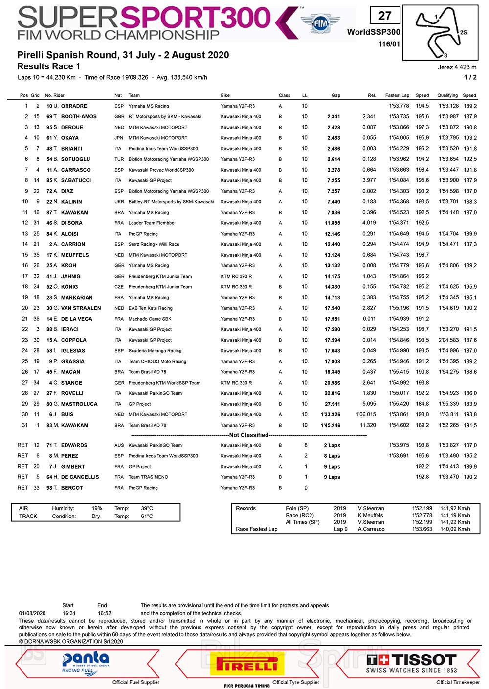 Η πρώτη ημέρα του Pirelli Spanish Round έκλεισε με τον συναρπαστικό αγώνα της μικρής κατηγορίας Supersport 300, κάτω από τις καυτές θερμοκρασίες, για την έναρξη της σεζόν WorldSSP 2020 στην πίστα της Jerez – Angel Nieto.