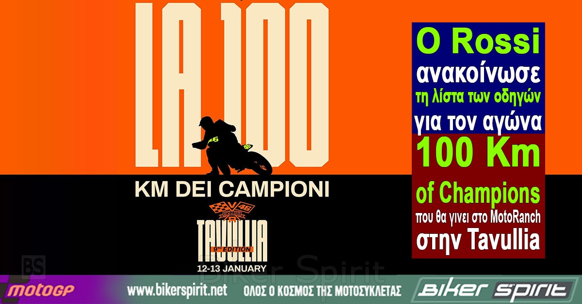 Η ένατη έκδοση του αγώνα flat track «La 100 km dei Campioni» στο MotoRanch του Valentino Rossi στην Tavullia θα πραγματοποιηθεί στις 12 και 13 Ιανουαρίου.