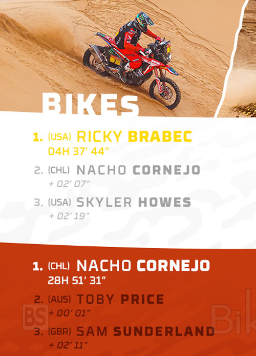 Ο Αμερικάνος εργοστασιακός αναβάτης της HONDA Ricky Βrabec κάνοντας ένα αγώνα τακτικής τις προηγούμενες ημέρες είχε μείνει περισσότερο από είκοσι λεπτά πίσω στη γενική πριν το Rest Day. Σήμερα οδηγώντας πολύ επιθετικά και χωρίς λάθη κέρδισε την ειδική μειώνοντας το χρόνο από την κορυφή στα 14.52 λεπτά ανεβαίνοντας στην 8η θέση της γενικής.